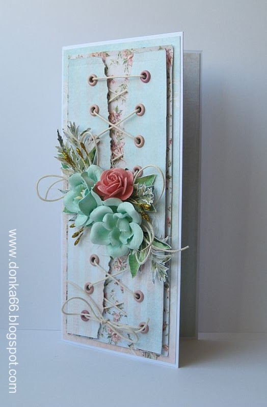 Nie wiem, czy tego rodzaju kartka rzeczywiście nosi taką nazwę, ale mnie się jednoznacznie kojarzy z gorsetem. Niby nic takiego, kilka nitowych oczek i kawałek sznurka, ale efekt końcowy tego "plątania" bardzo mi się podoba :)